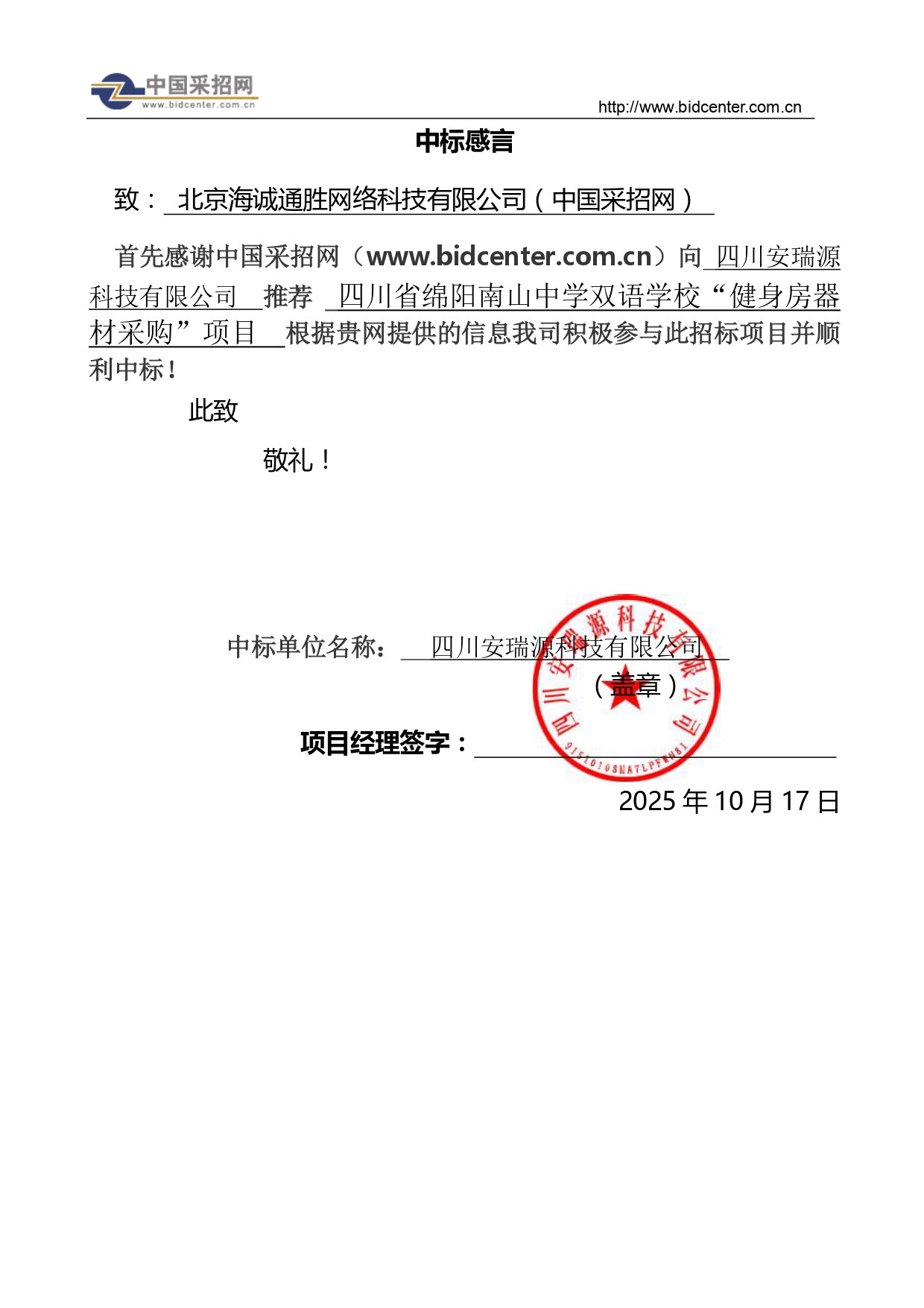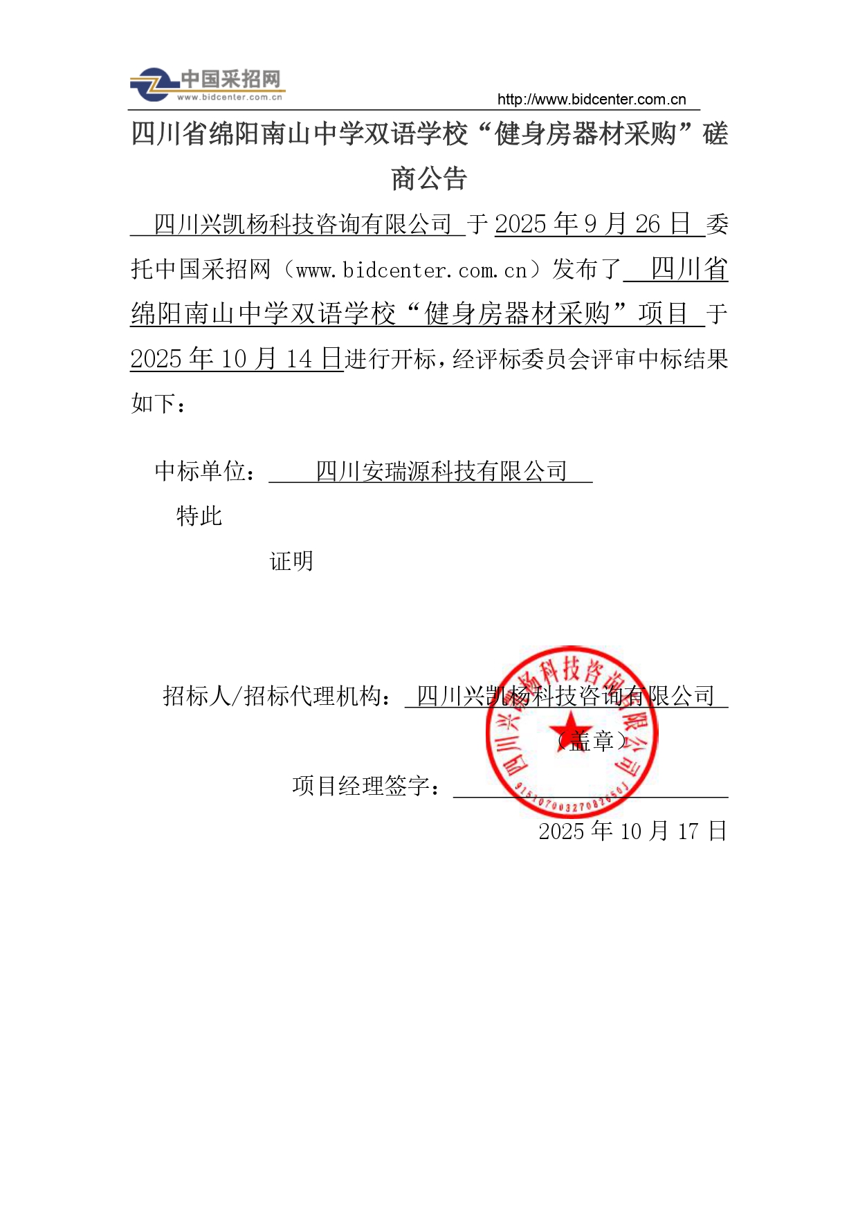 中标项目: 四川省绵阳南山中学双语学校“健身房器材采购”成交公告