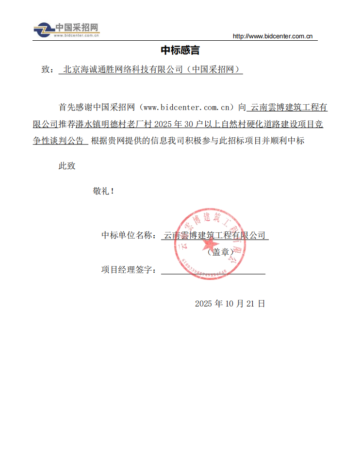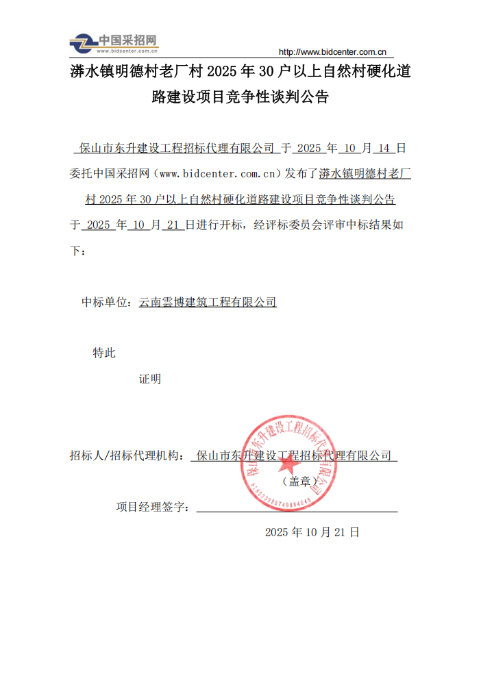 中标项目: 漭水镇明德村老厂村2025年30户以上自然村硬化道路建设项目竞争性谈判公告