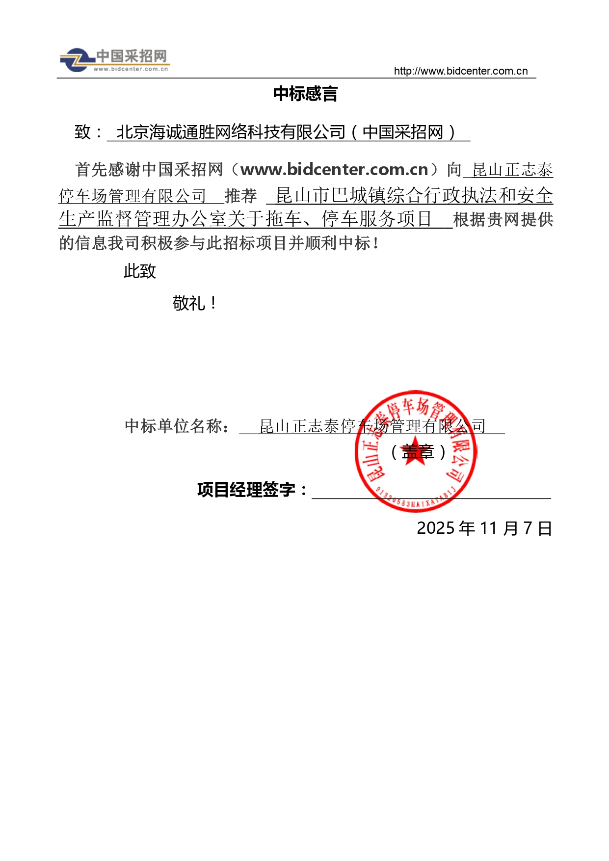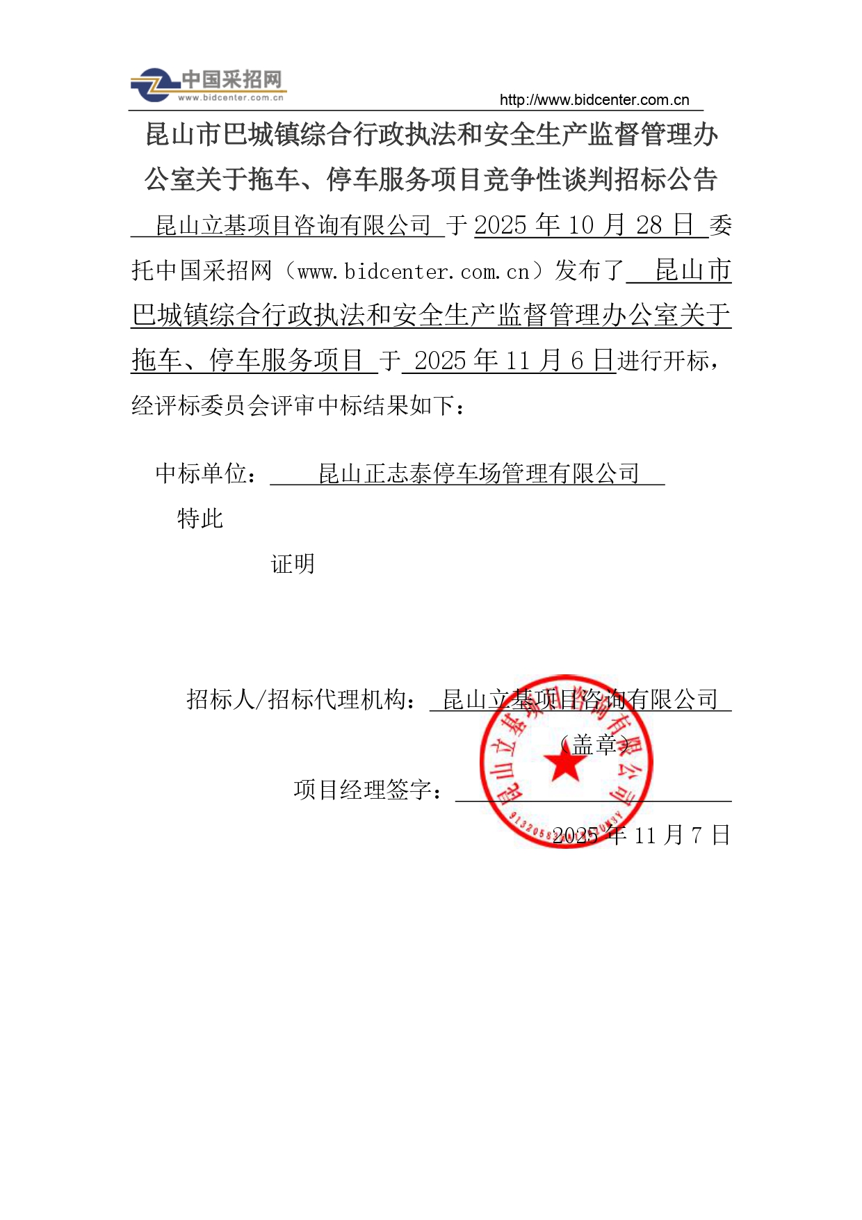 中标项目: 昆山市巴城镇综合行政执法和安全生产监督管理办公室关于拖车、停车服务中标公告