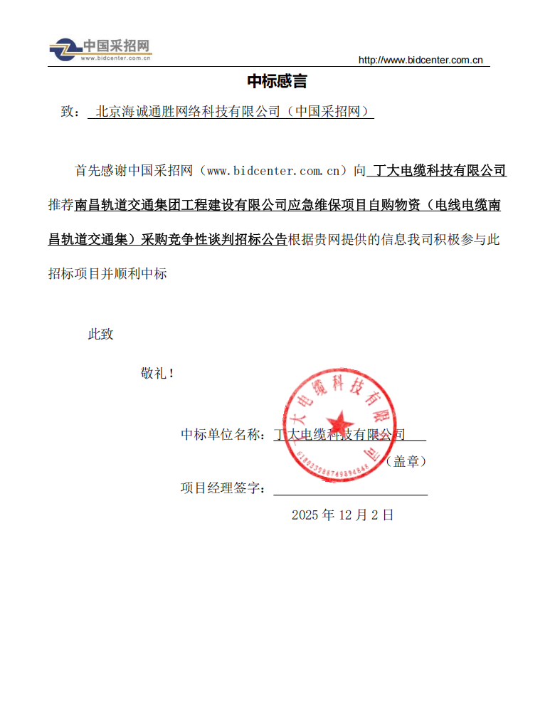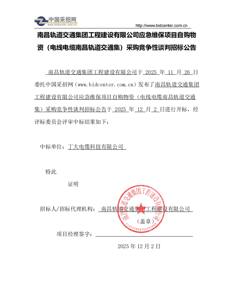 中标项目: 南昌轨道交通集团工程建设有限公司应急维保项目自购物资(电线电缆南昌轨道交通集)采购竞争性谈判招标公告